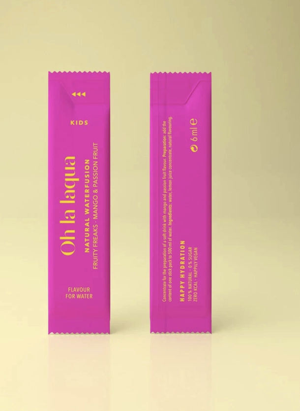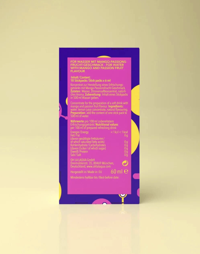 Üks pakk OH LA LAQUA Fruity Freaks ᛫ Mango & Passion Fruit sisaldab 10 käepärast pulkpakki, millest igaüks sisaldab 6 ml Natural Waterfusioni. Lisa lihtsalt ühe pulkpaki sisu poole liitri mineraal- või kraaniveele, mis on gaseeritud või gaseerimata. Vedel kontsentraat lahustub otse vees, ilma et oleks vaja segada, loksutada või oodata. Ja sinu mango-passionvilja maitsega infundeeritud vesi on valmis. 100% looduslik, ilma magusainete ja kaloriteta.