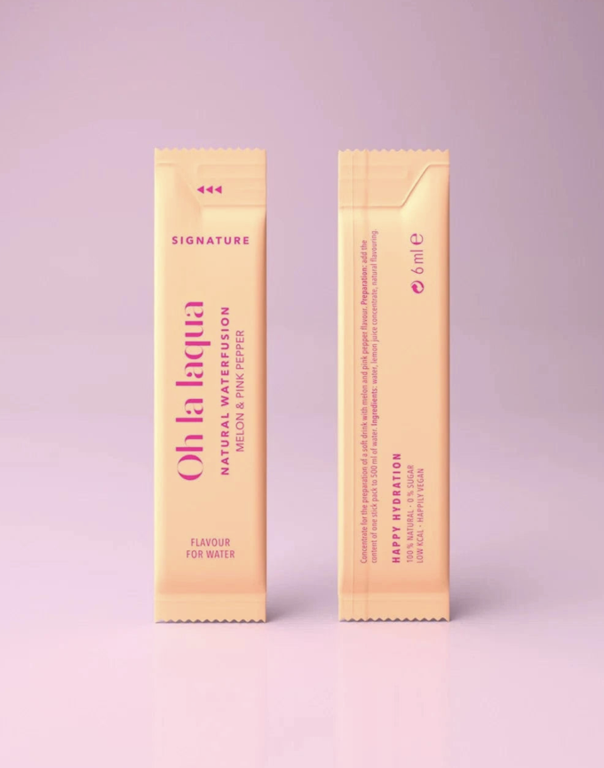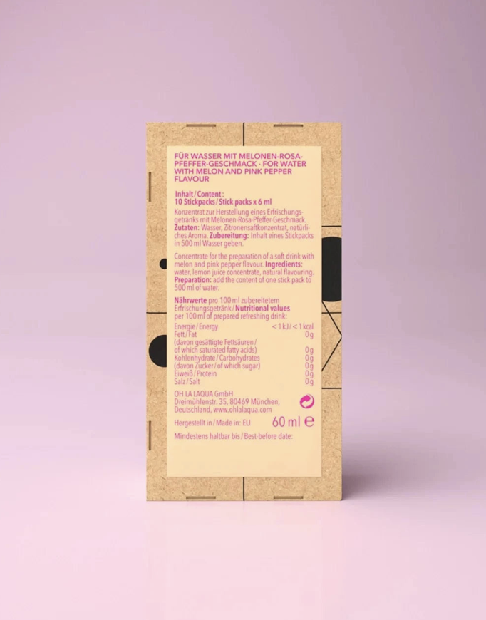 Üks OH LA LAQUA Melon & Pink Pepper pakk sisaldab 10 käepärast pulkpakki, millest igaüks sisaldab 6 ml Natural Waterfusioni. Lisage lihtsalt ühe pulkpaki sisu poole liitri mineraal- või kraaniveele, mis on gaseeritud või gaseerimata. Vedel kontsentraat lahustub otse vees, ilma et oleks vaja segada, loksutada või oodata. Ja teie meloni ja pipra maitsega vesi on valmis. 100% looduslik, ilma magusainete ja kaloriteta.