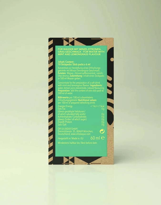Üks OH LA LAQUA piparmündi ja sidrunheinaga joogi pakk sisaldab 10 käepärast pulkpakki, millest igaüks sisaldab 6 ml looduslikku vesijooki. Lisa lihtsalt ühe pulgapaki sisu poole liitri mineraal- või kraaniveele, mis on gaseeritud või gaseerimata. Vedel kontsentraat lahustub otse vees, ilma segamise, loksutamise või ootamiseta. Ja teie piparmündi ja sidrunheinaga maitsestatud vesi on valmis. 100% looduslik, ilma magusainete ja kaloriteta.